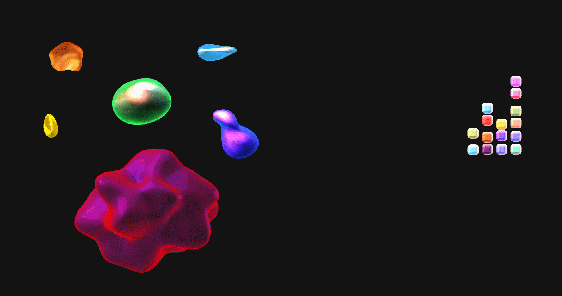 Applied color, depth, noise, matcap, and fresnel in different ways across each object to create a sense of visual distortion..